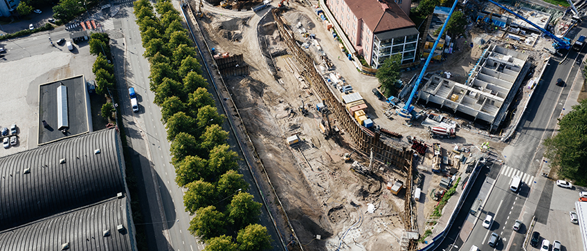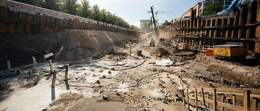 Kohteen pohjarakennustyöt todettiin poikkeuksellisen vaativiksi verrattuna normaaleihin asuinkerrostalokohteisiin. Olemme tehneet kohteeseen noin 10 metriä syvän kaivannon, paalutuksia noin 2000 porapaalun ja 900 lyöntipaalun verran ja ponttiseinää noin 5000 neliötä, sekä paikallaanvalurakenteita ja jälkijännitystä. Pora ja lyöntipaaluja on kohteeseen tehty yhteensä noin 35 km verran.