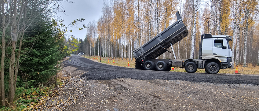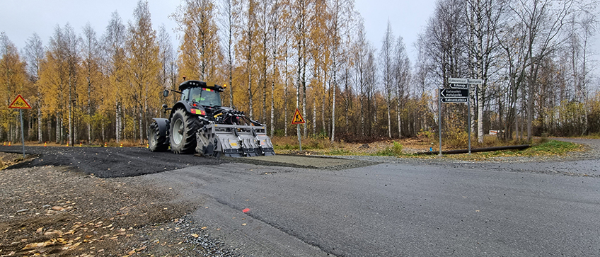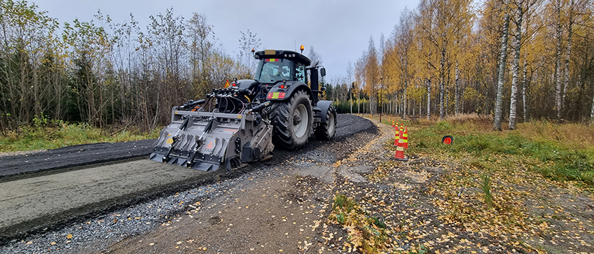 Joensuun kaupunki levensi Kuhasalon ulkoilualueelle johtavaa Kukkosensaarentietä 1,5 metriä, jonka jälkeen murskasimme tielle 10-15 senttimetriä paksun kulutuskerroksen SORAMIX-menetelmällä. Kulutuskerrokseen murskattiin mukaan asfaltti- ja betonimursketta, jonka ansiosta urakassa säästettiin maa- ja kiviaineksia noin 500 tonnia.