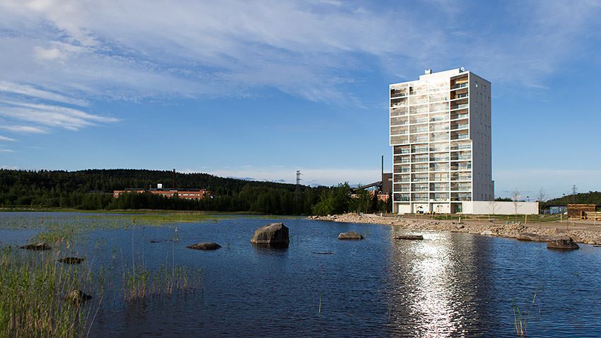 Maailmanpylväs – tornitalo järven rannalla Jyväskylässä