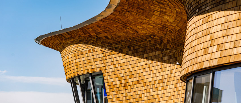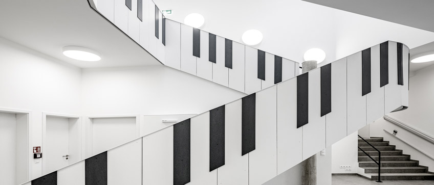 Rakennuksen geometria muistuttaa muodoltaan sientä. Sisustuksen hallitseva elementti on portaiden keskikaide, joka esittää pianon koskettimia.