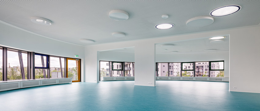 Pyöreä kattoikkuna ja muut lukuisat ikkunat antavat luonnonvaloa. Huoneissa on akustiset katot. Lattiat takaavat lämpö- ja aistimukavuuden sekä helpon huollon. Toisessa kerroksessa on tilava terassi.