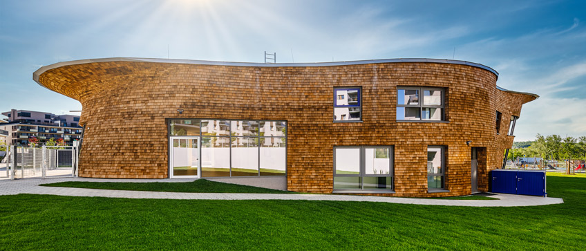 Rakensimme päiväkodin Prahan kaupunkiin, Tšekkiin. Sen muotoilu on pohjoismaista tyyliä ja siinä on myös panostettu luonnonmateriaalien käyttöön.