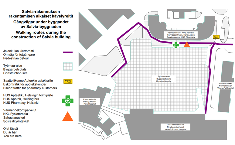 Liikennejärjestelyiden yhteydessä muuttuu HUS Apteekin saattoliikenteen paikat Palvelukeskuksen Naistenklinikan puoleiseen päätyyn. Saattoliikenteen paikoissa pysäköinti on sallittu 10 minuutiksi.