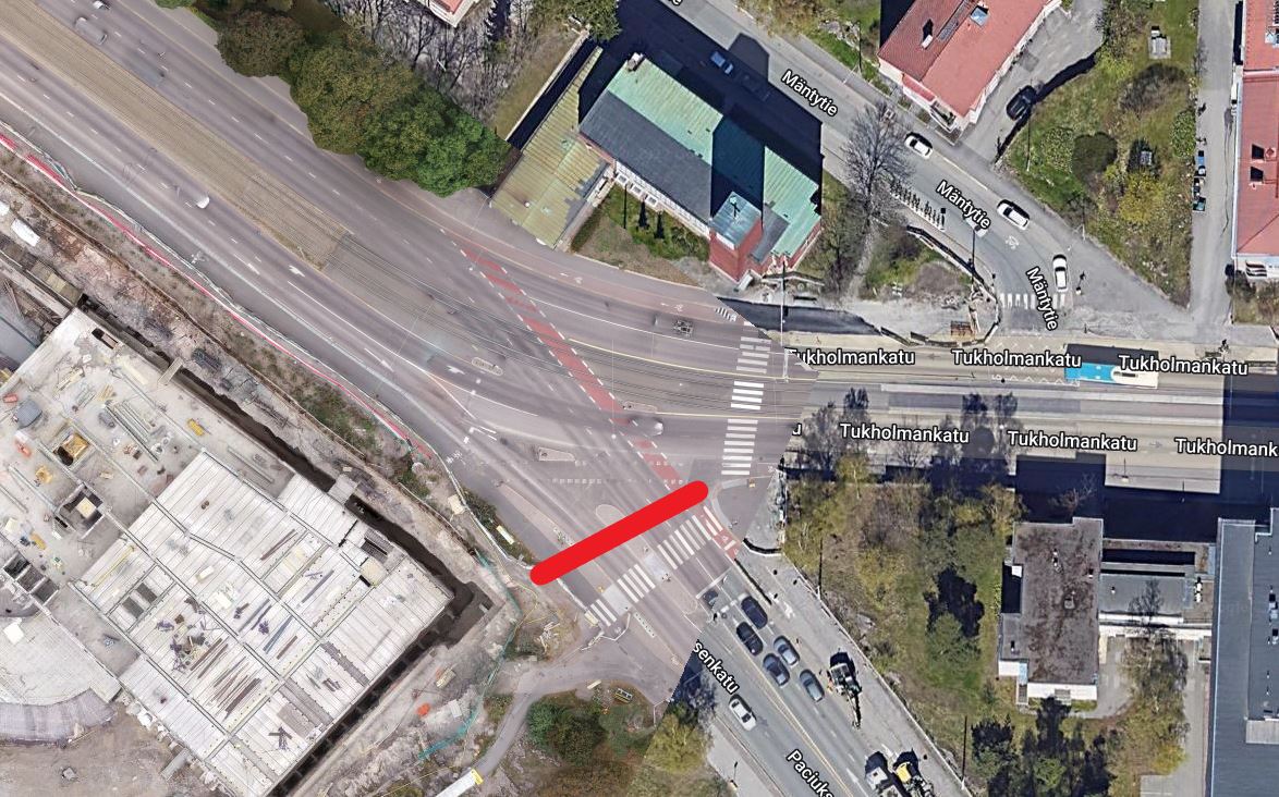 Kaukolämpöliittymä HUS Tammisairaalalle kaivetaan Paciuksenkadun ja Tuhkolmankadun risteyksen läpi.