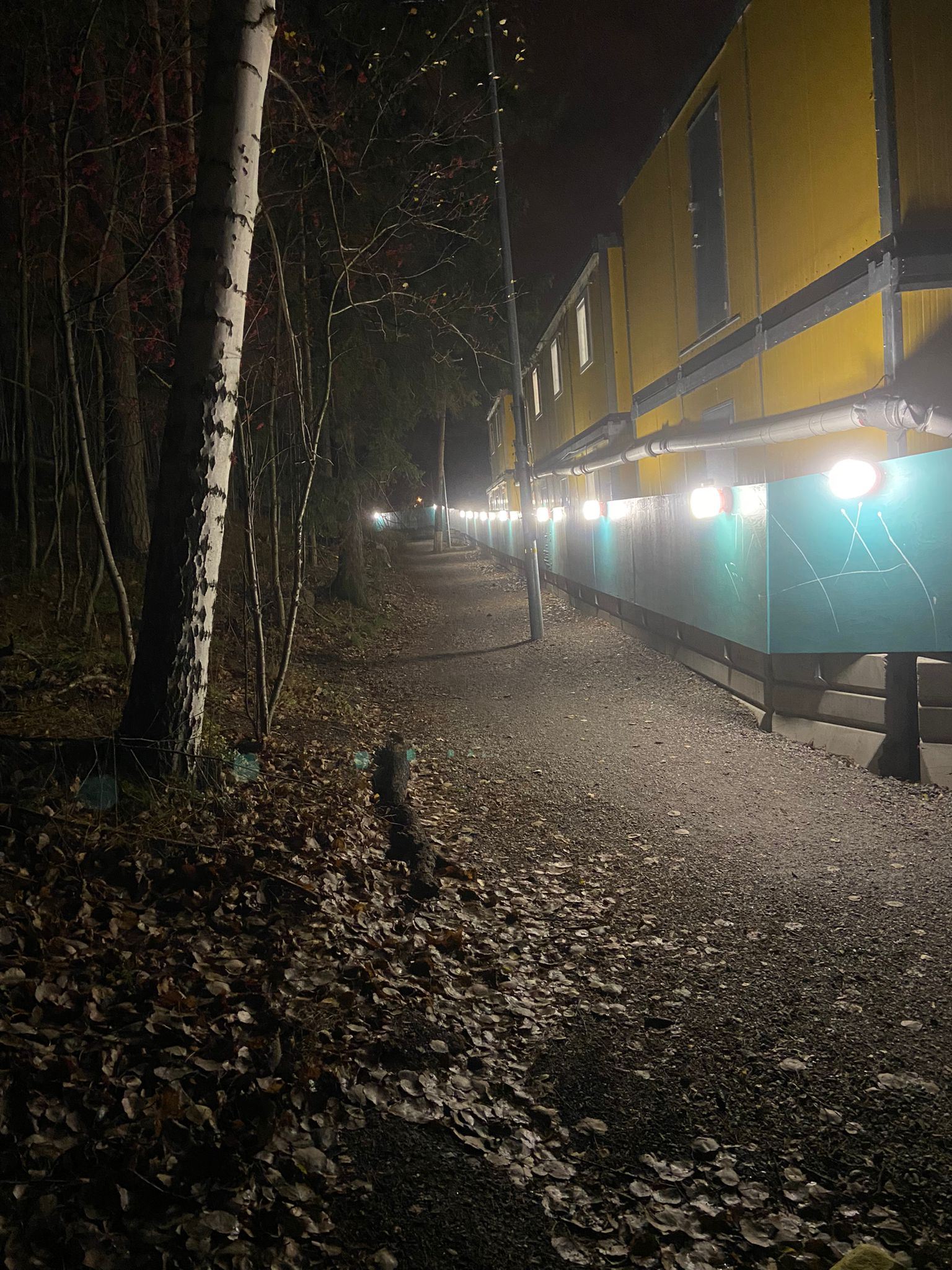 Yleisvalaistusta on jälleen lisätty alueella. Tällä kertaa asensimme työmaan vierustaa pitkin kulkevan väliaikaisen polun varrelle runsaasti valaistusta (Zaidankatu-Liikuntakeskus väliselle osuudelle). Aiemmin valaistusta on lisätty Paciuksenkadulta Liikuntakeskukselle johtavalle, väliaikaiselle kulkutelineelle.