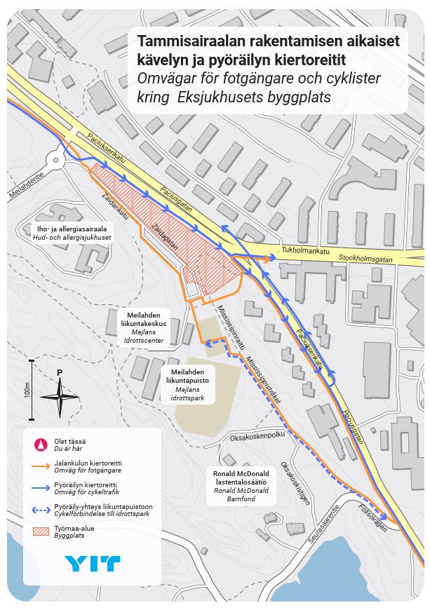 Siirrämme viikolla 17 kevyenliikenteenväylän Zaidankadulta Paciuksenkadulle. Jalankulkureitit muuttuvat myös. Käyttöön tulee jalankulkusilta, jota pitkin pääsee Paciuksenkadulta Meilahden liikuntakeskukselle ja -puistolle. Lisäksi jalankulku mahdollistetaan Zaidankadun kautta Meilahden liikuntakeskukselle ja puistolle kuvan mukaisesti.