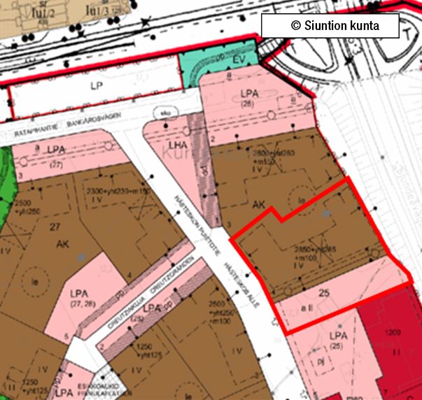 MMyytävä kerrostalotontti Siuntiossa. Tontin pinta-ala on 4 666 m² ja kaavamerkintä on AK. Tontin kerrosluku on IV. Rakennusoikeusmerkintä on 2 850+yht285+m100 k-m² (ensimmäinen luku ilmoittaa asuntokerrosalan neliömetrimäärän, toinen luku asukkaiden yhteiseen käyttöön, varattavan kerrosalan neliömetrimäärän ja kolmas luku osoittaa myymälätilaksi (liike- ja toimistotilaa) varattavan kerrosalan neliömäärän).