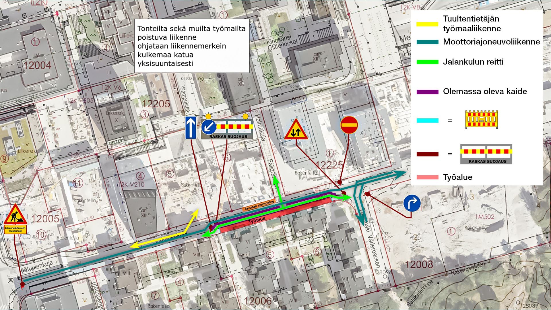 Ajoneuvoliikenne ohjataan katutyömaan läheltä yhdelle ajokaistalle idän suuntaan, kuvan mukaisesti. Kulku Tapiolantieltä (Kehä 1) Itätuulenkujan kautta Etelätuulentielle estyy.