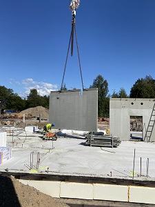 Kuvissa pilarielementit asennettuna omille paikoilleen sekä seinäelementin asennusta parasta aikaa.