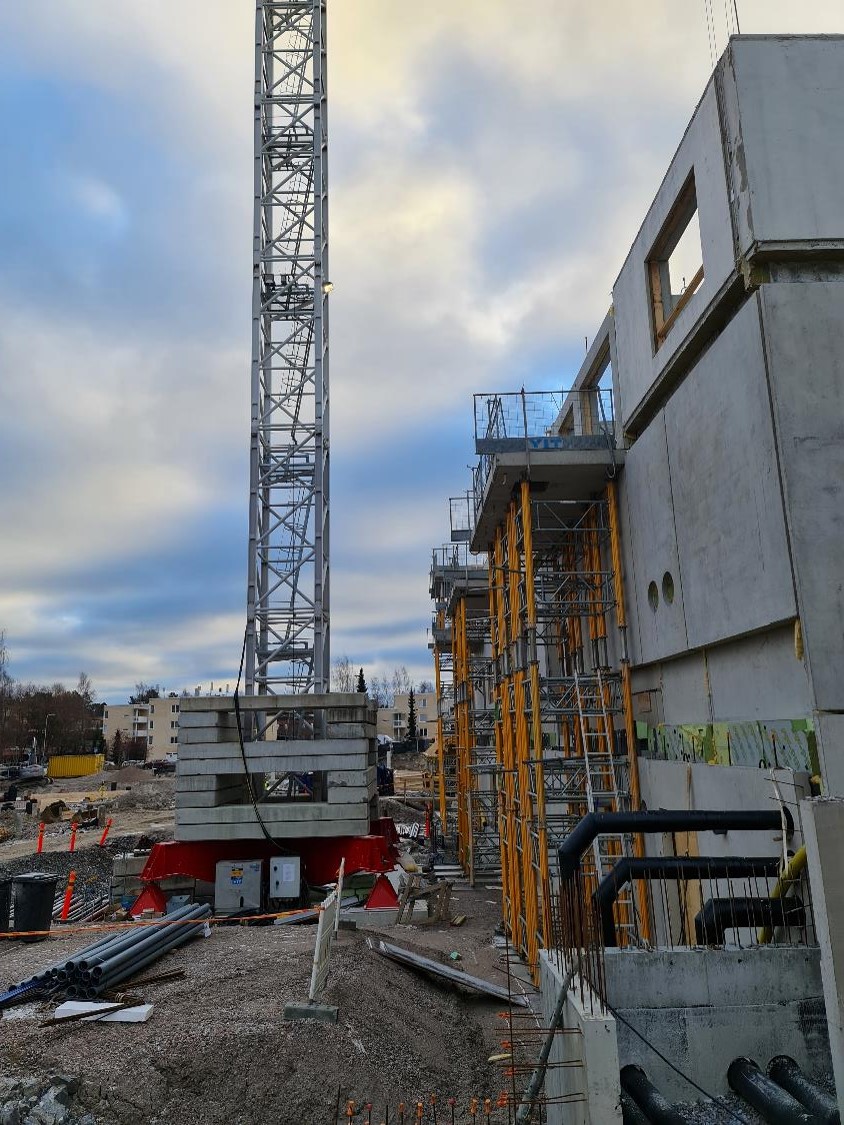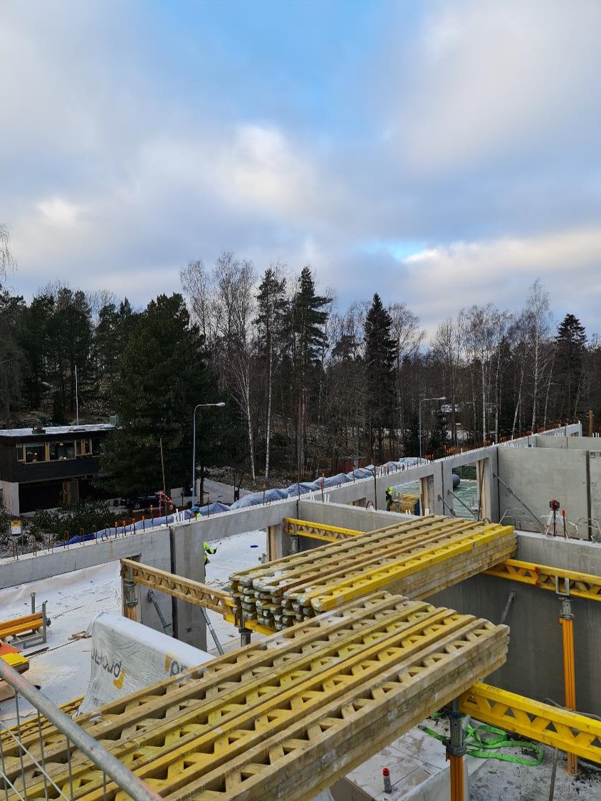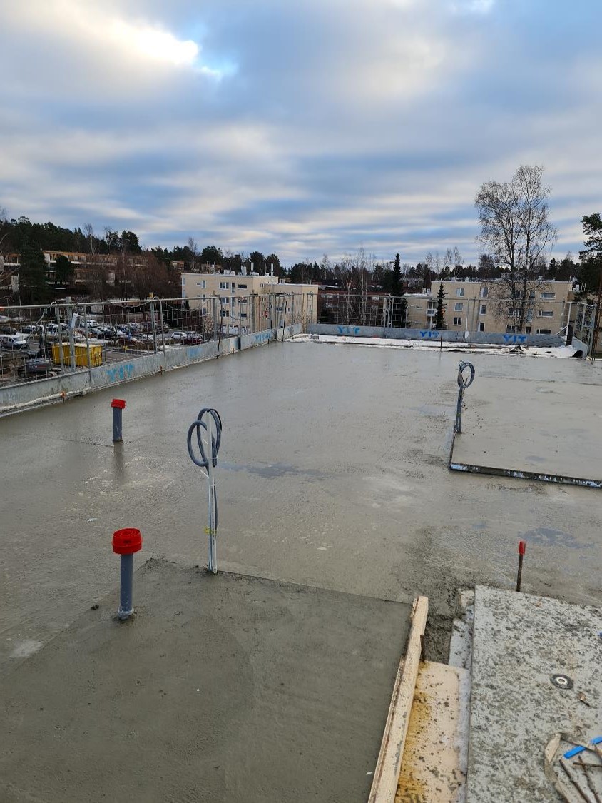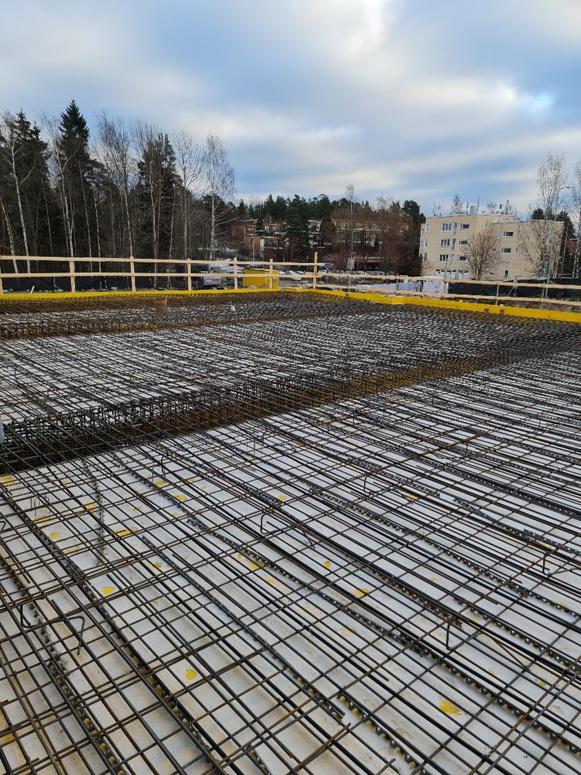 Korttelissa ensimmäisen taloyhtiön elementtiasennus etenee ja tällä hetkellä käynnissä on 2.kerroksen asennukset. Samaan aikaan myös autohallin ensimmäisen vaiheen työt etenevät raudoitustöillä ja siellä päästään betonoimaan ensi viikon aikana.