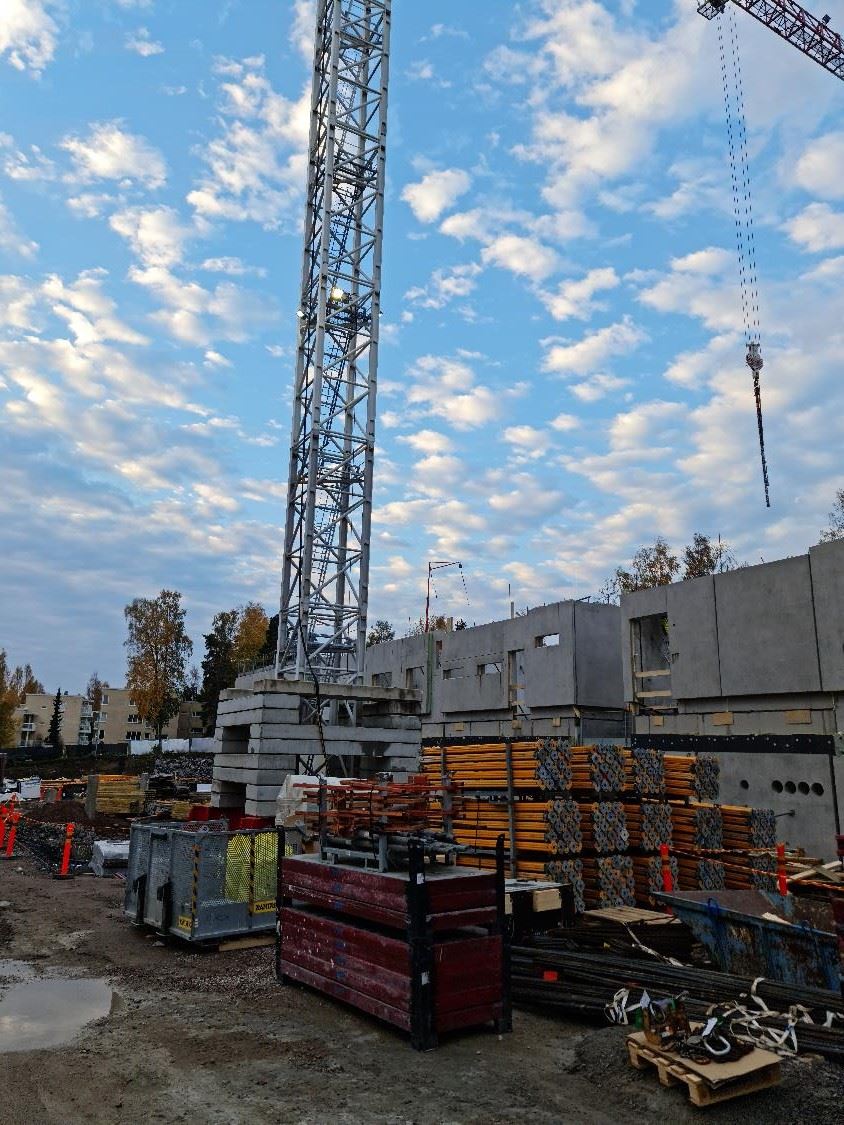Ensimmäisen kerroksen elementit ovat pääosin asennettu ja tällä hetkellä käynnissä on myös toisen kerroksen välipohjan muotitustyöt.