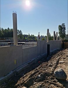 Kellarikerroksen seinäelementit alkavat olla paikoillaan ja tänään asensimme ensimmäisen kerroksen ontelolaattoja.