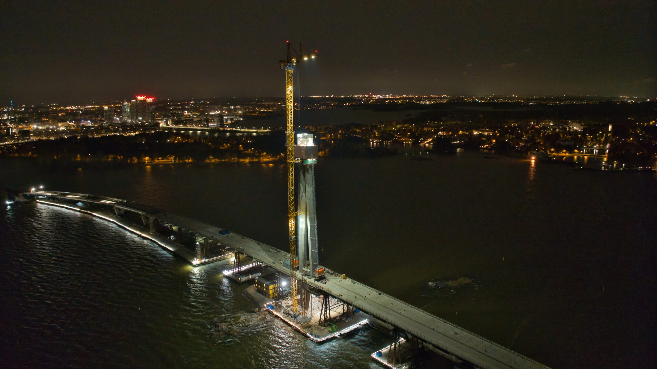 Kruunuvuorensillan vinoköysiosuuden teräspalkit asennettiin paikoilleen merinosturilla kesällä 2023.