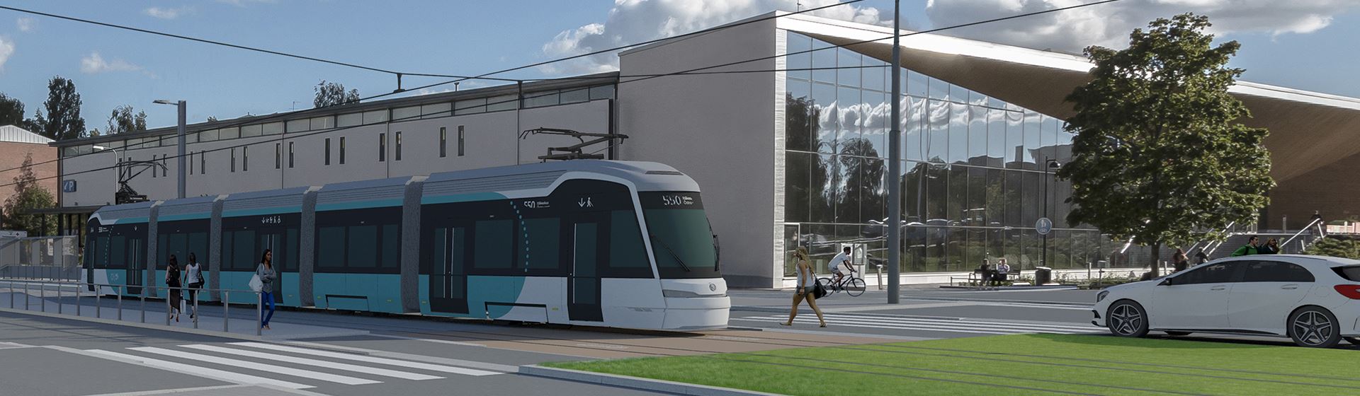 Raitiovaunujen värit ovat valkoinen, musta ja turkoosi.