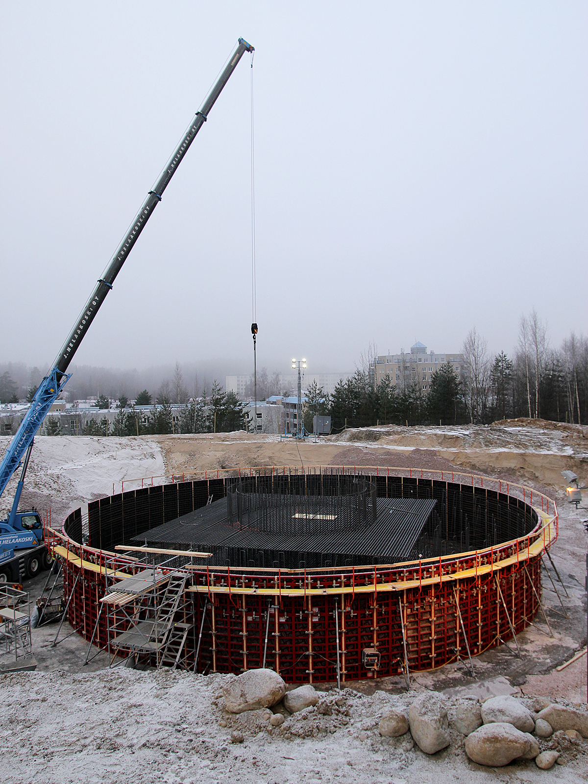 Ennen betonisen massiivilaatan valamista, maapohjan päälle valettiin ohut betoninen pohjalaatta, jonka päälle rakennettiin varsinaisen massiivilaatan muotti. Muotin sisälle tuli vahva raudoitus, jossa on terästä yli 200 tonnia.